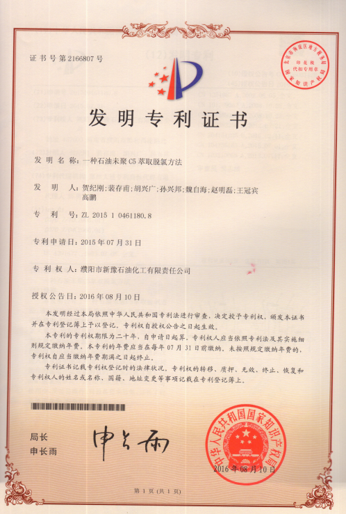 一種石油未聚C5萃取脫氧方法證書
